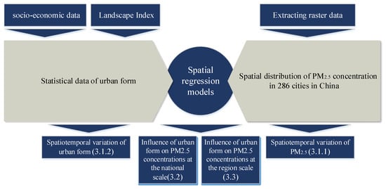 This study differs from existing studies in the following aspects: (1) it conducted long-term spatiotemporal analyses of PM2.5 concentrations annually in 286 prefecture-level cities in China. (2) The urban landscape index and urban socioeconomic index were used to characterize urban form. (3) On the one hand, when the road density low, the development of road traffic is conducive to reducing PM2.5 concentration. On the other hand, when road traffic develops to a very high level, increasingly crowded roads will increase PM2.5 concentration. (4) Excluding the effects of meteorological and geographic conditions, most of the more-developed cities or areas, which have a higher degree of urban development (except for fragmentation, other urban-form indicators have less of an impact on PM2.5), should exhibit moderately decentralized and polycentric urban development. (5) For less-developed cities and shrinking cities, the single-center development model can better mitigate PM2.5 pollution than the multicenter development model. The above points define the specificity of this study. The research results will further analyze the relationship between urban morphology and PM2.5 concentration in combination with existing relevant research so as to provide a reliable reference for urban planning and urban air quality improvement. This paper is separated into five parts: the first part contains the introduction and research objectives; the second part contains the research methods and data sources; the third part contains the data sources and variable calculations; the fourth part contains the analysis and discussion; and the fifth part contains the conclusions and research prospects with a detailed discussion of the study’s limitations. The flow chart of the article is shown in Figure 1.