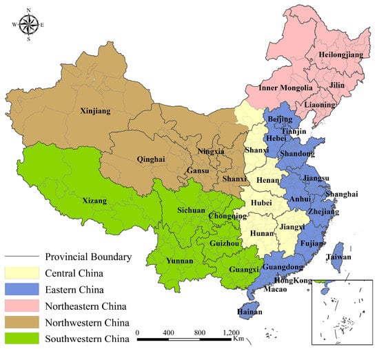 Prefecture-level cities, with large urban area and population scale, have advantages in terms of their economic structure and geographical location. They are not only present in all parts of China but reflect the development trend of urbanization and regional economic characteristics [24]. In this study, 286 prefecture-level cities were selected as our sample. According to the degree of urban development in different regions and the different climatic and geographical conditions, Chinese cities are divided into the eastern region, central region, northeastern region, northwestern region, and southwestern region. Development of the above areas was uneven. The eastern regions have large cities, strong economic strength, and high population density [26]. Being the most developed area of China, the eastern region consumes large amounts of natural resources to maintain urban development and socioeconomic growth. The situation is similar in the eastern and central regions. Relative to the eastern and central regions, on the one hand development of the northeastern and northwestern regions is unbalanced, on the other hand problem of population loss is serious in those area. Most cities in northeastern China are resource-based or resource-exhausted. Urban development has stagnated, and cities have contracted. The degree of urban development in northwestern China is low; most cities are in a stage of rapid or embryonic development, and the urban compactness and the stability of their spatial structure are low. It is worth thinking about how the PM2.5 concentration increased between 2000 and 2015 in two regions. To cut down PM2.5 concentration, it is essential to determine the relationship between urban form and PM2.5 concentration in five different regions. Furthermore, through the comparison between countries and regions, we can better understand the impact of different urban forms on PM2.5 concentration and provide better suggestions for decision makers to reduce PM2.5 concentration. The classification of the study area is shown in Figure 2.