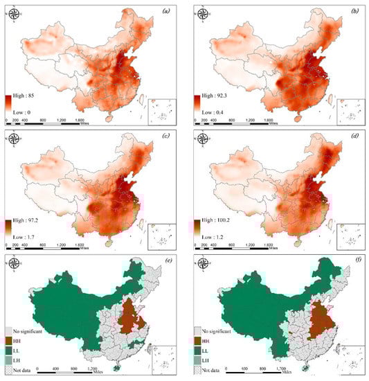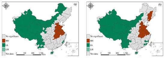 The spatial autocorrelation was weaker in 2000 (Moran’s I = 0.734) than in 2005 (Moran’s I = 0.777), 2010 (Moran’s I = 0.78), and 2015 (Moran’s I = 0.779). The trend of the change in spatial autocorrelation was the same as that of PM2.5 concentration. As shown in Table 1.