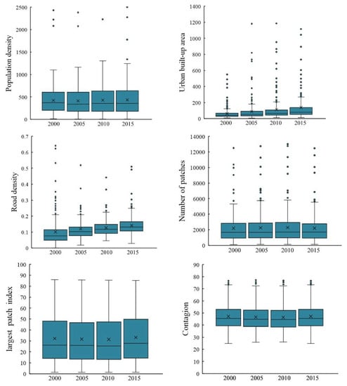 As is shown in Figure 5, the population density of all cities increased slightly from 423.4 in 2000 to 433.9 in 2015, indicating that the urban population has become more concentrated over the past two decades. Urban built-up areas also became larger during this period, as is indicated by the urban area index, which increased from 61.69 in 2000 to 137.21 in 2015. Road density increased from 0.1 in 2000 to 0.14 in 2015, reflecting the concentration of traffic and the degree of urban development. The number of patches showed a trend of increasing first and then decreasing, from 2206.1 in 2000 to 2278.7 in 2010 to 2209.3 in 2015, indicating that the urban form experienced dispersion and aggregation as cities developed. The trend of the largest patch index and contagion also reflects this situation. The largest patch index initially decreased from 32.17 in 2000 to 31.37 in 2010, followed by an increase to 33.14 in 2015. Contagion decreased initially from 47.1 in 2000 to 46.4 in 2010 but then increased to 47.2 in 2015. The trends of these three types of indicators indicate that the development of prefecture-level cities changed from decentralization to centralization. The contiguity and compactness of urban areas as a whole have increased.