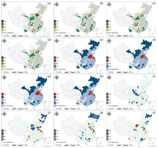 LISA cluster map of urban index in Chinese cities from 2000 to 2015. Panels (a–d) show the spatial clusters of population density between 2000 and 2015; panels (e–h) show the spatial clusters of urban areas (built-up areas) from 2000 to 2015. Panels (i–l) show the spatial clusters of road density between 2000 and 2015. Specifically, HH indicates a city with a high population density (urban area, road density) surrounded by cities with high population density (urban area, road density); LL indicates a city with a low population density (urban area, road density) surrounded by cities with low population density (urban area, road density); HL indicates a city with a high population density (urban area, road density) surrounded by cities with low population density (urban area, road density); and LH indicates a city with a low population density (urban area, road density) surrounded by cities with high population density (urban area, road density).