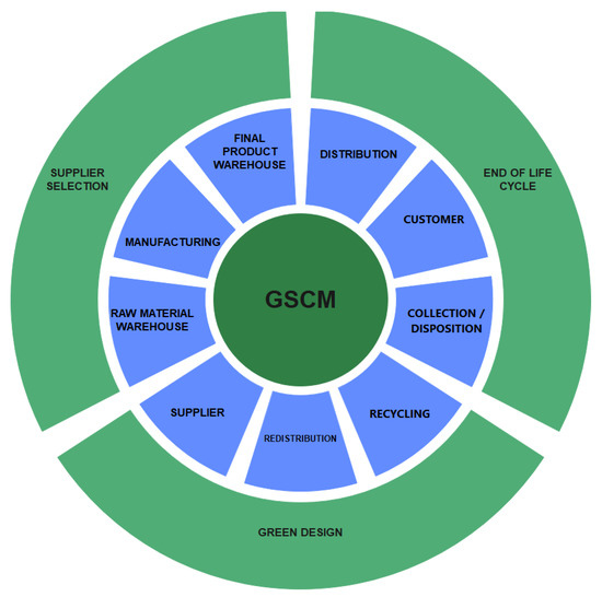 When dealing with GSCM, the related activities [18,19,20] should be conducted thinking about the reduction in the environmental impacts. From the supplier selection activity to the reverse logistics process, what should be considered in the key development process are those aspects that are treated in a cyclical way, i.e., the reverse logistics, either post-sale (return of a product to the manufacturer) or post-consumption (return of a product at the end of its useful life), which may be an input of remanufactured or recycled raw materials that can be used in the production process.