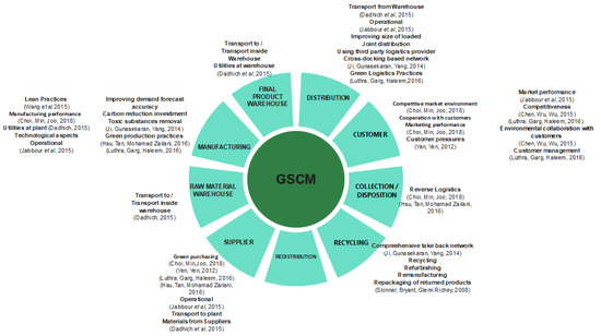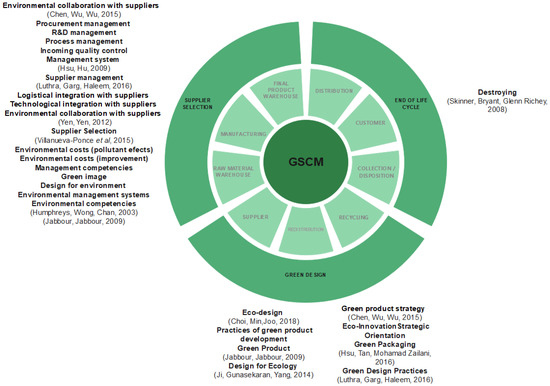 The existing literature brings important contributions to the area, relating the different “operation factors”, such as green design [10], green purchasing [11,12] and supplier selection [13,14,15], production [12,16], distribution [10,16], reverse logistics [12], and final destination [16]. The inclusion of these important studies is related to the need for an update and review of the important publications used so far in the systematic literature review and content analysis [2,3,4,17].
