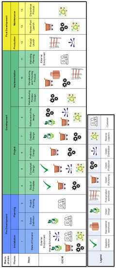 The construction of the preliminary model (Figure 5) was conceptually based on the existing relationships between the activities existing in the external and internal environments of the GSCM (Figure 1, Figure 2, Figure 3 and Figure 4) and the macrophases, phases and, steps of the IPDP model proposed by Pereira and Canciglieri Junior [53]. These relationships are emphasized in the columns “Contribution” and “Macrophases, Phases and steps of the proposed preliminary model” of Table 10.
