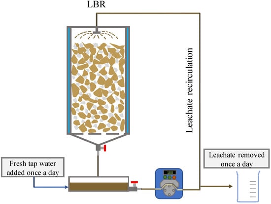 In this study, three identical 120-mL bench-scale LBRs (Figure 1), with an internal diameter of 3.4 cm and a bed height of 9.5 cm were operated in parallel. The waste chamber had a volume of 100 mL (CM bed volume), and the leachate collection chamber was 400 mL. The temperature was regulated at 36 ± 1 °C, by recirculating heated water in the reactor jacket. Leachate was recirculated and distributed evenly over the waste matrix to provide sufficient solid–liquid contact. Initially, an experimental set of 6 runs was performed using the first batch of CM (Table 3, R1.1–R6.1). LBRs were loaded with CM in each experimental run, using zeolite as the only bulking agent (BA) (mean diameter 2–2.5 mm). The BA/CM ratios (volume of BA to volume of CM bed) tested were 10% (R1.1–R5.1) and 3.5% v/v CM bed (R6.1). A control run (R2.1) was performed using river pebbles with a similar particle size instead of zeolite, with a BA/CM ratio of 10% v/v. Tap water was added daily at loadings of 3.40 g g−1 wet weight of CM (all runs but R4.1) and 6.79 g g−1 wet weight of CM (R4.1). The leachate produced was collected in the leachate chamber and recirculated to the top of the CM bed at different ratios (2.88 mL mL−1 CMbed.d−1 in all runs but R3.1 and 5.76 mL mL−1 CMbed.d−1 in R3.1). The total amount of leachate (in all runs but R5.1) or half of it (in R5.1) was removed and replaced with fresh tap water daily, to achieve the desired HRT (1 d in all runs but R5.1 and 2 d in R5.1, respectively). The first three runs, which produced the best results, were repeated using the CM collected some months later (batch 2). This second set of experiments is labelled as R1.2, R2.2, and R3.2 (Table 3). The solid loading was kept as similar as possible in all runs, with an average value of 12.01 ± 1.23 gr VS (CI 95% 11.52–12.50). Therefore, in all runs performed, the CM volume in LBRs was kept the same, leading to slightly different dry matter loading with respect to wet weight (ww). Each run was conducted for 6 days, since the COD extracted on the sixth day was minimum (Figure S1), and the leachates were removed and replaced with fresh tap water daily. The total quantities of COD and TAN mass extracted were estimated after measuring the total chemical oxygen demand (COD) and the total ammonia nitrogen (TAN) concentrations in each leachate portion removed. Moreover, the concentration of volatile fatty acids (VFAs) and pH were determined.