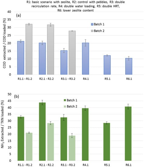 In conclusion, the results presented herein suggest that the best leaching strategy, leading to more COD extraction, was that applied in R1.1 and R1.2, with 10% zeolite at a water loading of 5.24 g per g TS of CM, a leachate recirculation rate of 2.88 mL mL−1 CM bed d−1, and an HRT of 1 d. On the other hand, at an HRT of 2 d, more NH3 was retained in the CM bed, but the COD of the leachate was less (probably due to aerobic microbial activity). However, the latter may not be a disadvantage if the LBR is optimized to operate as an anaerobic digester and, therefore, the methanogenic activity is enhanced.