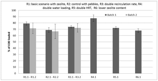 The ratio of zeolite to CM was high (10% v/v or 0.76 g gTS −1), to maintain the porosity of the CM bed. As a result, the leachate percolated easily through the CM and succeeded in transferring COD into the leachate at a percentage of 21.3 ± 0.9% (CI 95%, 20.3–22.3) in the basic scenario with the zeolite and 20.2 ± 1.1% (CI 95%, 19.0–21.5) in the control test using the first batch of CM (R1.1 and R2.1, respectively, Figure 2a). Similarly, the COD transferred summed up to 32.1 ± 4.3% (CI 95%, 26.1–338.1) and 31.8 ± 0.7% (CI 95%, 30.9–32.8) in the repetition of the tests using the second batch of CM (R1.2 and R2.2, respectively, Figure 2a).
