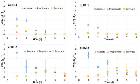 VFA (acetate, propionate and butyrate) concentrations in the leachates during the 6-day operation of the LBRs. Ri.j: Run under the ‘i’ condition with CM from the ‘j’ batch. i = 1 (zeolite), 2 (pebble) and j = 1, 2.