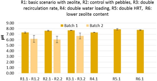 Figure 4 shows the profiles of the VFAs in the leachates obtained from the LBRs filled with the (a) zeolite and CM from batch 1 (R1.1), (b) pebbles and CM from batch 1 (R2.1), (c) zeolite and CM from batch 2 (R1.2), and (d) pebbles and CM from batch 2 (R2.2). In other words, the results from the tests with the zeolite are compared with those obtained with the pebbles (control) for the two batches of CM, which had different characteristics (Table 1). It seems that no correlation can be made for the VFA production. Although the VFA concentration was higher in the leachates of the LBR in the presence of zeolite (R1.1 vs. R2.1), this fact was not verified when the tests were repeated with another batch of CM (R1.2 vs. R2.2). The acetate concentration was higher in all cases, while propionate and butyrate concentrations were generally lower. Isobutyrate, valerate and isovalerate were also measured, but were detected at non-appreciable concentrations (below 0.1 g L−1; data not shown). In the runs performed with the second batch of CM, propionate and butyrate concentrations were higher on the fourth day (Figure 4c,d). These results imply that the VFA production depended on the CM used and was not affected by the presence of zeolite or pebbles. Moreover, during the leaching process, it seems that hydrolysis/acidogenesis and acetogenesis took place, while methanogenesis was not observed (no methane was detected in the gas phase). Therefore, replacing the leachate every day with water and not inoculating the LBRs did not favor methanogenesis, making it possible to interpret the results as the effect of the physicochemical process of leaching through an organic waste-zeolite (or pebble) bed and the biochemical processes of hydrolysis/acidogenesis and acetogenesis, which inevitably occur in anaerobic environments under a short HRT. The average pH (Figure 5) was lower in the runs conducted with the second batch of CM, which accords with the higher concentration of VFA noticed in the leachates. However, due to the presence of NH3 and VFA, the pH was kept at almost neutral levels (between 6 and 8)