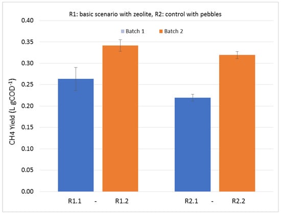 The methane potentials (LCH4 g−1 COD) of the leachates obtained from the experiments with the LBRs filled with zeolite and pebbles and with CM from different batches are shown in Figure 6. These leachates were removed from the first day of LBR operation, which had the highest organic load. The leachates coming from the CM/zeolite mixtures (R1.1 and R1.2) had higher BMP than the leachates coming from CM/pebble mixtures (R2.1 and R2.2), respectively. The leachate from the CM-batch1 with zeolite yielded 0.263 ± 0.027 LCH4 g−1 COD, while the leachate from the control test (CM-batch1 and pebbles) yielded 0.219 ± 0.008 LCH4 g−1 COD (p-value = 0.0079). In the case of the tests done with the CM coming from the second batch, the BMPs of the leachates were 0.342 ± 0.013 LCH4 g−1 COD (zeolite) and 0.319 ± 0.008 LCH4 g−1 COD (control), which are statistically different at a 95% confidence level (p-value = 0.0089). The leachate coming from the second batch of CM had a higher BMP in all cases (mixed with either zeolite or pebbles), implying that the organic matter was more biodegradable, probably indicating that the CM in batch 2 was fresher than the CM in batch1. It appears that zeolite favored the BMP of the resulting leachate. The TAN concentrations in the leachate of the first day from the CM/zeolite and CM/pebble mixtures in the case of CM-batch1 were 2.249 ± 0.098g L−1 (pH 7.10) and 2.833 ± 0.236g L−1 (pH 7.61), respectively, while in the case of CM batch 2, the NH3-N was even lower. The equivalent free ammonia concentrations were (Equation (4)) 31 and 123 mg NH3-N L−1, respectively for CM batch 1 and much lower in the case of CM batch 2. It is well known that the inhibition levels of ammonia for methanogenesis, if the methanogens have not been acclimatized, are above 3000 mg L−1 as TAN and 150 mg L−1 as free ammonia (NH3-N) [29]. Therefore, no inhibition was expected at these ammonia concentration levels; nevertheless, the statistically significant difference observed in the BMP of the leachates was attributed to the presence or absence of zeolite in both cases of CM, verifying that the zeolite favored the biodegradability of the leachates. The positive effect of zeolite has been explained by Milan et al. [43]: the properties of zeolite to (a) offer high capacity for immobilization of microorganisms, (b) facilitate the ammonia/ammonium cation equilibrium, and (c) achieve a reduction of TAN and free ammonia in the solution. Fotidis et al. [29] verified that the increase in the methane yield in bioreactors, in which the zeolite was added at high concentrations, could not only be attributed to the ammonia concentration reduction (i.e., the reduction of ammonia concentration was slight compared to the high increase in the methane yield). Moreover, in the present work, the zeolite was not transferred in the liquid leachate, nor was it present during the BMP tests, to support the argument of being an ideal support for the microorganisms’ growth. It is possible that the cations (Na+, Mg2+, Ca2+) of zeolite, exchanged for ammonium adsorption on its active sites [44], had a positive impact on the methanogens’ growth. It is also possible that other zeolite components were released in the leachates, resulting in this positive correlation with methanogenesis.