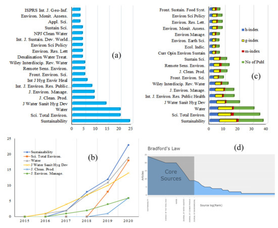 Characteristic features of publications on sustainable development of water and sanitation research. (a) Most relevant sources of SDG 6 publications. (b) Source dynamics (cumulative) of SDG 6 research by source. (c) Source local impact (h-index). (d) Source clustering through Bradford’s law of SDG 6 research sources.