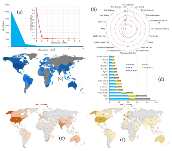 Analysis of authors, institutions and countries related to sustainable development of water and sanitation research. (a) Author productivity through Lotka’s law. (b) Most relevant affiliations. (c) Spatial distribution of total scientific production in SDG 6. (d) Countries hosting most corresponding authors on SDG 6 research. (e) Spatial distribution of single country publications (SCP) on SDG 6. (f) Spatial distribution of multi-country publications (MCP) on SDG 6.