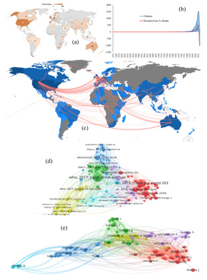 Analysis of countries, documents, and academic cooperation related to sustainable development of water and sanitation research. (a) Spatial distribution of total citations (TC). (b) Reference publication year (RPY) spectroscopy. (c) World map of collaboration of publications on SDG 6. (d) Co-citation network by documents. (e) Co-citation network by authors.