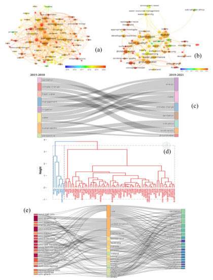 Analysis of keywords and research trajectories on sustainable development of water and sanitation research. (a) Co-occurrence word network of Keywords Plus. (b) Co-occurrence word network of authors’ keywords. (c) Temporal trend of thematic development of SDG 6 research. (d) Topic dendrogram of Keywords Plus of SDG 6 research. (e) Three field plot depicting highest performing affiliations (left), countries (middle), and research focus (right) related to sustainable development goal 6 research globally.