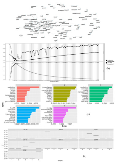Text mining on sustainable development of water and sanitation research. (a) Bigram network plot of SDG 6 research. (b) Results of four methods for topic selection (Griffiths 2004, CaoJuan 2009, Arun 2010, Deveaud 2014). (c) Top occurring keywords associated with five distinct topics. (d) Temporal occurrence of five topics related to SDG 6 research.