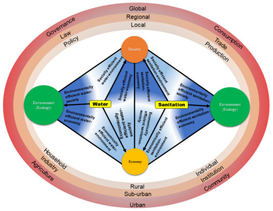 We also need the framework to be multifaceted respective to other connections of water and sanitation. This is necessary because we need to implement and apply the insights generated for fundamental research in water and sanitation. For this purpose, we can connect water and sanitation research for sustainability to six nodes. Each node represents a different aspect of the application or distinguished magnitude of connection in the real world. We have segregated each node into three layers. Though intricately connected, each consecutive layer (from inner to outer ring) represents an increase in magnitude or operational area or complexity. This also means that each element in a ring is inclusive of the related element in its inner ring. These are (1) local → regional → global, (2) production → trade → consumption, (3) individual → institution → community, (4) rural → sub-urban → urban, (5) household → industry → agriculture, and (6) policy → law → governance.