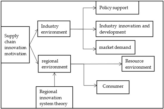 A supply chain is the organizational form of a series of activities, such as joint manufacturing, logistics and transportation, and customer demand, aiming to improve the production capacity level, promote the efficiency of logistics, meet customer demand, and realize the maximization of interests and optimal resource conditions. However, the traditional supply chain has many disadvantages which are not conducive to reducing the cost and increasing the efficiency of logistics links. With the development of information technology, intelligent logistics arises at the same historical moment. Supply chain enterprises refer to enterprises that coordinate logistics activities such as order management, warehousing, sorting, and transportation. The birth of supply chain enterprises symbolizes the regulation and informationization of logistics activities, and their competitiveness is remarkable in traditional logistics enterprises. At present, the integration of supply chain enterprises and Internet technology has spawned a new stage of development and has formed supply chain innovative enterprises. The motivation of supply chain innovation enterprises comes from two aspects: one is the industry environment, the other is the regional innovation environment. Firstly, the regional innovation system theory puts forward the view that the regional innovation environment will have a certain impact on the development of enterprises in the region. The industrial environment is divided into market policy, industrial innovation and development, and market demand. Market policies include laws and regulations, management systems, and government service systems. The promulgation of policies affects the overall environment of enterprises. Positive policies can boost the development of enterprises, stimulate the vitality of enterprises, and form a good “enterprise industry” double cycle; it is helpful to realize the sustainable development of supply chain innovation enterprises. Industry innovation and development is the embodiment of high industry concentration and the overall trend of enterprises. The constant change of market demand promotes the transformation and upgrading of enterprises, which is mainly reflected in the penetration and application of informatization. Regional environment covers resource environment and consumer environment. Resource environment refers to enterprise capital, information, and other elements. Capital assistance is the booster for enterprises to accelerate. A large amount of information collection is conducive to the improvement of the competitiveness of enterprises in market innovation. The consumer environment is the feedback performance of market demand. The improvement of market demand requires the consumer environment to be more immediate, transparent, and traceable. The conceptual diagram of the development motivation of supply chain innovation enterprises is shown in Figure 1.