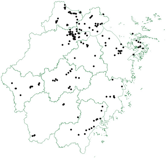 This study aims to analyze the spatial distribution of supply chain innovative enterprises in Zhejiang Province. Since Zhejiang Province implemented the policy of promoting supply chain innovation in 2019, the “14th Five-year plan” of developing the modern supply chain was put forward in 2021. Therefore, the enterprise sources selected were the first batch and the second batch of the supply chain innovation pilot enterprises. Through the coordinate picker system of the Tencent location service, the specific coordinates of 187 supply chain innovation enterprises in Zhejiang Province were obtained. Using the ArcMap 10.8 software, https://developers.arcgis.com (accessed on 17 October 2021), the vector map of Zhejiang Province was imported as the base map and the spatial coordinate points of the enterprises were located to obtain the distribution map of points. In addition, variable indexes obtained in this study include GDP, number of employed persons in the secondary industry, number of employed persons in the tertiary industry, employment density, education level, and urbanization rate in Zhejiang Province. Data of variable indexes are all from the Statistical yearbook of Zhejiang Province in 2019 and 2020. The setting and description of each variable are shown in Table 1: