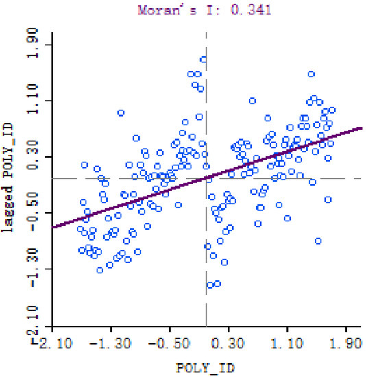 However, spatial global autocorrelation analysis can only reflect global characteristics; it ignores local relationships. Therefore, this study further conducted a local Moran index analysis. The results of the analysis form a LISA cluster graph, it can be shown in Figure 4.