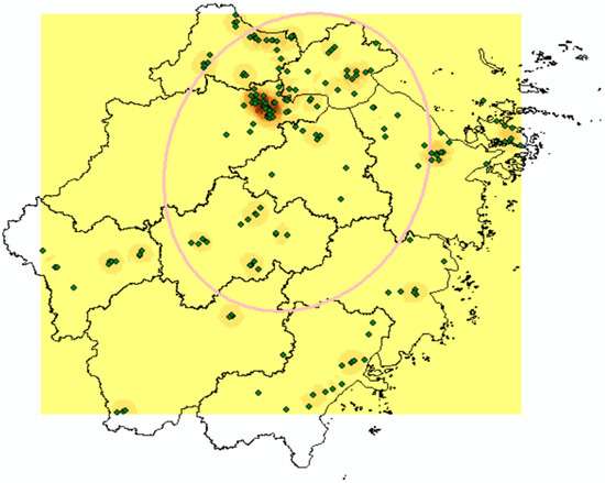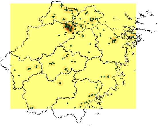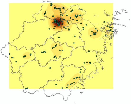 In order to further observe the spatial pattern characteristics of supply chain innovation enterprises, the Spatial Analyst option of ArcMap10.8 software allows for the point density estimation of 187 point factors. The color concentration of the point density is proportional to the aggregation situation, and the aggregation of the decimal point forms the nucleus point, which represents the location of the density center. The estimated figures of point density and kernel density obtained through analysis are shown in Figure 5 and Figure 6. Through the point density and core density estimation map of supply chain innovation enterprises, it can be seen that the supply chain innovation enterprises in Zhejiang Province are dominated by a distribution pattern in which Hangzhou is the strong center and Hangzhou Hujia the multi-center. Secondly, they also show the distribution characteristics of “one main point and multiple points”, and the multi-intensive distribution of the main points in the east of Hangzhou. The distribution of enterprises is mainly concentrated in the northern part of Zhejiang Province. The density of enterprises in Ningbo, Zhoushan, Jinhua, and Wentai is more concentrated, while the density of enterprises in Lishui is more dispersed, which may be caused by the level of economic development and the radiation influence of neighboring cities.