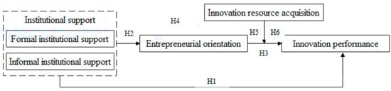 Institutional theory holds that the success of enterprise innovation depends not only on the internal resources of the organization, but also on the external institutional environment [15]. Studies have pointed out that institutional support is a key element of resource allocation and other economic activities in the enterprise social relationship network [16]. Limited by their initial resources, new ventures need to constantly seek external innovation resources to meet their own development needs, but the liability of newness will increase the difficulty of obtaining innovation resources [17]. Existing studies have confirmed that institutional support has a positive effect on firm resource acquisition [15]. In practice, it is generally recognized that institutional support can boost the innovation and development of new enterprises [18]. Institutional support for new ventures provides various resources and the entrepreneurial opportunities which enterprises need to transform into unique competitive advantages through operational decisions. Entrepreneurial orientation is a decision-making culture for new ventures to cope with environmental changes, and is a bridge connecting the external environment and organizational performance [19]. It can effectively transform resources and information obtained by organizations from the environment into competitive advantages, that is, institutional support may have an impact on innovation performance through entrepreneurial orientation. Practice shows that new ventures with strong access to innovation resources can obtain valuable information in the institutional environment at the lowest cost and utilize its entrepreneurial orientation, that is, innovation resource acquisition also has an important impact on the relationship between entrepreneurial orientation and innovation performance.