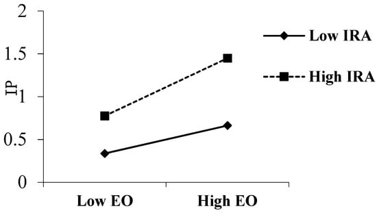 PROCESS was used to test the moderated mediation effects, as shown in Table 6. At the low level of innovation resource acquisition, the indirect effect value of entrepreneur orientation between formal institutional support and innovation performance of new ventures was 0.021, and the 95% confidence interval was (−0.056, 0.118), including zero. Under the high level of innovation resource acquisition, the indirect effect value of entrepreneur orientation between formal institutional support and innovation performance of new ventures was 0.079, and the 95% confidence interval was (0.019, 0.162), excluding zero. This indicates that the indirect effects of the two values were significantly different, that is, in the relationship between formal institutional support and innovation performance of new ventures, innovation resource acquisition can adjust the mediating role of entrepreneurial orientation, and H6a was supported. Similarly, under different levels of access to innovation resources, there were significant differences in the indirect effects of entrepreneur orientation between informal institutional support and new venture innovation performance, and H6b was also supported.