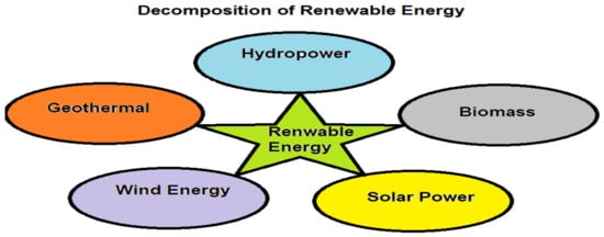 In Equation (1), environmental pollution was measured by carbon emissions and considered on the right-hand side. At the same time, the impact of the populations in rural and urban areas were measured in aggregate terms that were presented as the total population growth in each province. At the provincial level, economic progress was measured and aggregated by the production of total final goods and services in a year [,]. Two major classifications based on renewable and nonrenewable sources were used to estimate the impact of energy on carbon emissions. Renewable energy, hydropower, geothermal energy, biomass energy, solar power, and wind energy were aggregated, and further details are shown Figure 1.