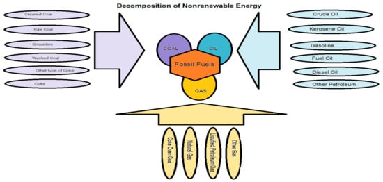 In the next step, six essential categories of coal energy, six primary types of oil energy, and four varieties of gas were incorporated into three sub-categories. Finally, the three categories were grouped into coal, oil, gas, and added into the LMDI as nonrenewable energy. This is presented in Figure 2.