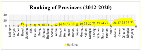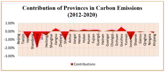 Five factors that contributed to China’s CO2 emission increase between 2012 and 2020 were examined as the country’s economic growth slowed. China’s CO2 emissions mainly increased due to fast and consistent economic growth that surpassed CO2 emission increases. However, when the share of this driver dropped in the new normal stage, the increased rate of emissions decreased. With a sluggish pace of growth, the economy of China transitioned from a high-quantity, fast-growth pattern to a high-quality, inclusive long-term growth pattern. As a result, economic restructuring met its original objectives. The impact of the consumption of renewable energy and fossil fuel energy decrease had grown in prominence, with greater emphasis on efficiency and quality. The contribution of Chinese provinces to carbon emissions for 2012 to 2020 is given in Figure 4.