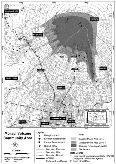 - Sikoki, B.; Nugroho, J.E.; Widanto, F.A.S.; Umam, N.; Sakti, E.; Kawuryan, I.S.S.; Purwanto, E.; Yugyasmono; Fatimah, D.; Suriastini, N.W.; et al. Merapi: Pemulihan Penghidupan Warga Pasca Letusan 2010, Laporan Studi Longitudinal; Ma’arif, S., Sulistianto, B., Prasodjo, S.B., Muhammad, L., Andriono, R., Bayudono, Paripurno, E.T., Topatimasan, R., Eds.; Badan Nasional Penanggulangan Bencana (BNPB): Jakarta, Indonesia, 2013; Available online: https://insistpress.com/katalog/merapi-pemulihan-penghidupan-warga-pasca-letusan-2010-laporan-survei-longitudinal/ (accessed on 24 July 2021).