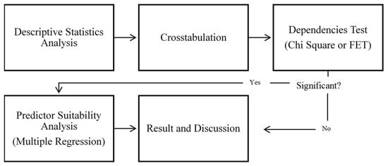 In this study, the data analysis is conducted in two stages: a non-parametric test and a parametric test (see Figure 2). The non-parametric test was used to see whether the social attributes of the community have dependencies to the implementation and outcome of pre-event DRR context (risk knowledge, information access, and network and stakeholders) in their community. A parametric test was used to see if the individual sub-variables could become the predictor of implementation and outcome of DRR programs based on the significant result from the non-parametric test (the goodness-of-fit test)