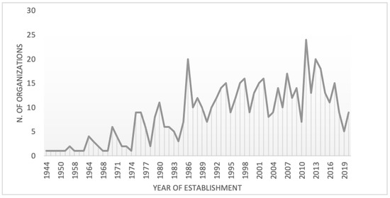 Regarding the legal form adopted, three-quarters (n = 433, 77.5%) of the organizations included in the dataset adopted either a legal form of volunteering organization, social cooperative or social promotion association, while other forms, such as foundations and non-social cooperative enterprises, seem not to be favored as a legal form by the representatives of the third sector. Regarding the area of intervention, organizations predominantly operate at local level, more specifically, at municipal, intermunicipal and regional levels, while interregional operations are only chosen by 4% of the 563 organizations included in this study. However, if we consider the top two categories of activities, civil protection/social care and health, the area of intervention of the organizations carrying out those activities seems to be slightly more equitably distributed, especially at the national level, where almost 50% of the total number of organizations implements civil protection/social care and health activities. Moreover, out of the 115 organizations carrying out health activities, approximately half of them (47%) adopted the legal form of volunteering organization, while the 162 organizations committed to conducting civil protection and social care largely chose the social cooperative legal form. To fully understand the temporal evolution of the Italian third-sector throughout the years, Figure 1 shows the number of organizations founded per year and included in the dataset.