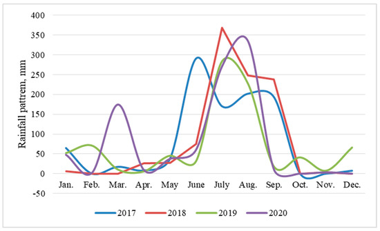 Rainfall pattern over the period of study (2017–2018 to 2019–2020).