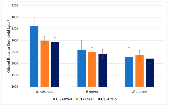 Among all the OSBs, B. carinata resulted in a maximum seed productivity (3173.8 kg ha−1), which remained significantly higher over B. napus and B. juncea. Likewise, the crop geometry of 60 cm × 60 cm produced the highest seed productivity (2836.4 kgha−1) but remained at par with a 45 cm × 45 cm crop geometry and significantly higher over a conventional crop geometry of 45 cm × 15 cm (Table 2 and Figure 2).