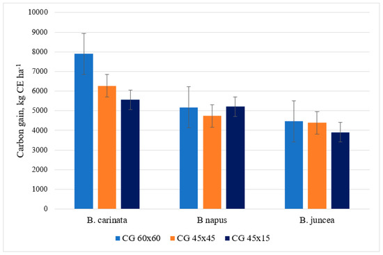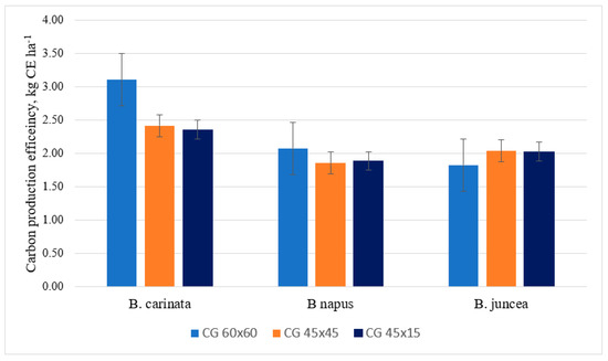 The level of carbon input remained the same under all the OSB species under varying crop geometries. However, the carbon gain, the carbon output, and the carbon production efficiency (Figure 3 and Figure 4) stand significantly higher under B. carinata. Similarly, a broader squared crop geometry at 60 cm × 30 cm resulted in a higher CG, CO, and CPE.