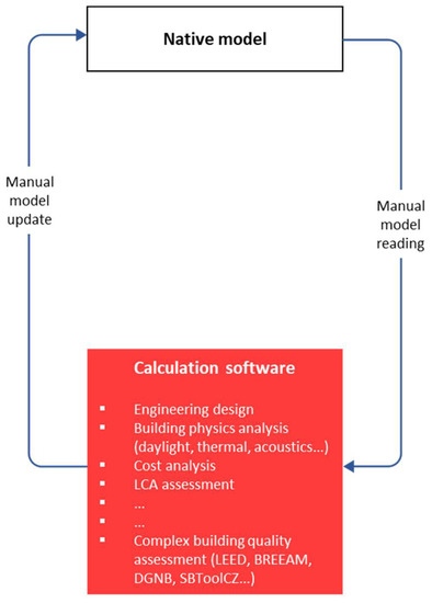 A semi-automatic workflow (Figure 3) uses calculations and analysis outside the data model in specific calculation software and tools, but the information needed for the assessment is exported in a predefined structure and can be automatically imported into the calculation software. Model data can be exported straight from the native model to the calculation tool in case the calculation software can read the data directly. This allows keeping the original data quality from the model. The model data from the native model can be exported in IFC format and then imported through the utilized database (e.g., .xls, .csv) or directly to the calculation software. Particular property or property sets and/or entities that are not common parts of the data model can be manually added in the calculation software. The results of the calculation and assessment can be uploaded back to the native model automatically in case of nongraphical information using sufficient data bridge or manually in case of graphical information. In the case of semi-automatic workflow, the time-consuming and manual part of the assessment process still remains, but communication processes and data exchange are efficient, and the risks of errors decrease.