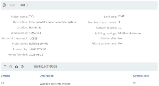 Complex quality assessment methodologies are more complicated than the standard LCA method already described in the literature and for which only the Bill of Quantities (BoQ) is necessary. A combination of all mentioned data types is needed for assessment; therefore, a more sophisticated data processing workflow is necessary. For SBToolCZ, an online application was developed. The whole assessment was completely online. The limitation is that so far, the application has only prepared the Excel tables. Therefore, it is not yet possible to import the IFC model directly. This is planned for version 2 of the application. The example with the TiCo project description is shown in Figure 8. The application can semi-automatically (with data prepared in the schedules) assess the building project, including different variants. It is suitable for the material and technical optimization of the project.