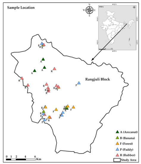 However, the shifts in land use have been reported to create significant differences in the soil health status [12,13]. Fluvial landforms like the Brahmaputra Valley of Assam, India, are prone to change in landforms and related land-uses in the due course of time [14,15] because of the shifting course of the Brahmaputra River. The Brahmaputra Valley is a part of Indus-Ganga-Brahmaputra plains covering a major area of the state of Assam in India. The Brahmaputra Valley is a structural depression whose evolution was governed by the eastern Himalayan syntaxis during the India-Eurasia collision [16]. The lower Brahmaputra Valley is characterized by large widths of channel belts and the development of large alluvial islands and wetlands, along with isolated hillocks sparsely distributed all over the lower Brahmaputra Valley. The varied geomorphology of the area has led to varied land use scenarios. The major land uses of the area are for paddy rice (Oryza sativa) in the younger and older alluvial plains with 0–1% slope, banana (Musa spp.) and arecanut (Areca catechu) in the older alluvial plains and char lands of 1–3% to 3–5% slope, and rubber (Hevea brasiliensis) in the uplands of 3–5% to 5–8% slope. A substantial area is also covered by a public reserve forest of sal (Shorea robusta) plantations in the uplands and inselbergs with a slope of 5–8% to 8–15% or more.