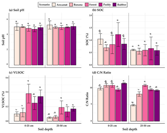 The soil pH was in the acidic range for all the scenarios, varying from 4.69 for paddy fields to 5.01 in arecanut cultivations. However, no significant difference (95% confidence level) was recorded in the soil pH among the scenarios (Figure 2). The pattern of variation of soil pH was paddy fields < sal forest < rubber plantations < banana systems < arecanut cultivations. All the soils had SOC values of > 0.5%. The highest SOC was recorded for paddy fields (1.23%) in the surface layer, followed by arecanut cultivations (1.05%). The lowest SOC was recorded for banana systems (0.7%). SOC in paddy fields was significantly different from banana systems only (p < 0.05); other land uses were at par with paddy fields and banana systems. The VLSOC, in contrast, was highest in sal forests (0.38%), followed by rubber plantations (0.34%). The C:N ratio of the surface soils showed a significant difference (Figure 2) and ranged from 9.4:1 for paddy fields to 11.3:1 for rubber plantations.