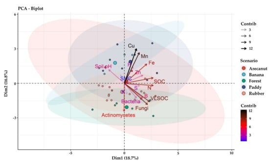 The PCA biplot of the individual scenarios (Figure 3) revealed that a change in the scenario also changed the characterization capacity of the soil parameters. For sal forests and rubber plantations, actinomycetes, fungi, and VLSOC were the highest contributors to variability. For banana systems, the variable parameters were for Mn, Cu, and soil pH, whereas for paddy fields, the variables were Cu, Mn, Fe, and SOC. For arecanut cultivations, actinomycetes, fungi, VLSOC, N, and soil pH were major the contributing variables. However, considering the cumulative loadings and the correlation matrix of the variables and the PCs, the variables found to be the deciding parameters for the soil quality of the study area, evident from their high correlation values in the six PCs (showing Eigenvalue > 1) were SOC, VLSOC, Cu, K, B, P, and the bacteria count. The population of fungi and actinomycetes also proved to be significant variables contributing to the soil quality.
