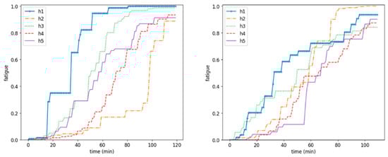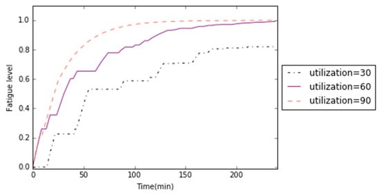 Example of fatigue accumulation during four hours of work with different utilizations.