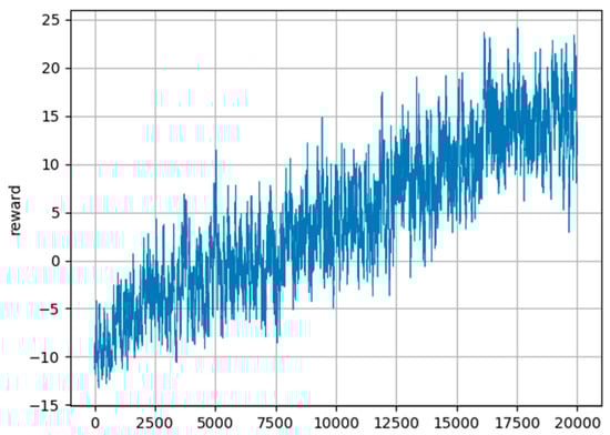 Figure 4 shows the cumulative reward for each episode during training of 20,000 episodes. It is observed that the reward value becomes higher as trainings are repeated, which implies that the agent allocates tasks while avoiding penalty and achieving rewards by completing given jobs on time.
