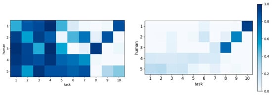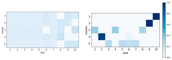 Under the SPT rule, tasks are allocated to humans with a high competence level for tasks in order to shorten the processing time. For instance, in the right part of Figure 7, it is observed that task is mostly assigned to human operator , who has the highest competence level for . Similarly, human operator , with a relatively high competence level for task is assigned much more than the other operators. With this allocation, it could be conjectured that operators with a high competence level for specific tasks can suffer from rapid accumulation of fatigue due to repetitive performance of tasks requiring a high competence level as in Equation (24).