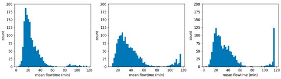 Mean flowtimes: proposed method (left), FIFO rule (middle), and SPT rule (right) for 1500 episodes.