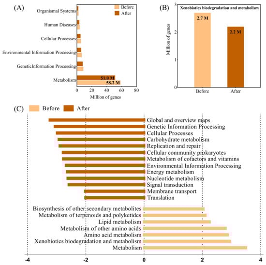 Predictive functional profiles of bacterial communities by PICRUSt in soil samples before and after remediation. (A) Genes corresponding to KEGG pathway level 1; (B) genes related to xenobiotics biodegradation in the KEGG pathway level 3; (C) histogram of LDA scores for differentially abundant genes. LEfSe analyses illustrating biomarker of each group and the effect size threshold of LDA was set to 2.0 in this study.