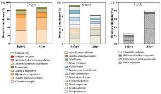 Soil biogeochemical functions unveiled by FAPROTAX. The biogeochemical cycling genes of carbon (A), nitrogen (B), and sulfur (C) were compared before and after bioremediation. The Y axis denoted the relative abundance of related genes.