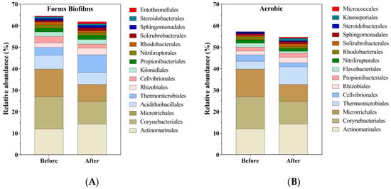 The relative abundance of bacterial community at phylum level (A) and order level (B). The taxa listed in the above figures were with a mean relative abundance >1%. Those with a mean relative abundance <1% were grouped as ‘others’.