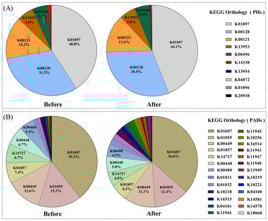 Predicted functional changes before and after bioremediation in relation to PHs (A) and PAHs (B).