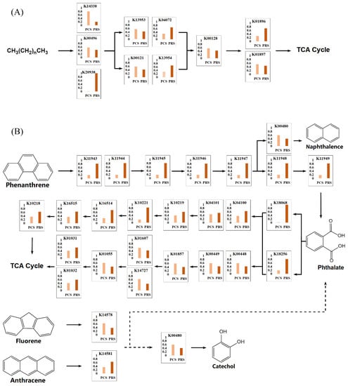 Various enzymes were involved in PHs and PAHs degradation. In both soil microbiomes prior to and after bioremediation, a total of 10 and 26 KEGG Orthology (KO) were detected in fatty acid degradation (KO00071) and polycyclic aromatic hydrocarbon degradation (KO00624), respectively (Table 2). Long-chain acyl-CoA synthetase, aldehyde dehydrogenase (NAD+), S-(hydroxymethyl) glutathione dehydrogenase/alcohol dehydrogenase, alcohol dehydrogenase, and alkane 1-monooxygenase were the predicted most abundant enzymes for PHs degradation before and after bioremediation (Figure 5A). For PAHs related metabolism, although the dominant functions were unchanged, the percentage of an array of enzymes increased noticeably after the bioremediation. These enzymes were 3-oxoadipate CoA-transferase, 4-hydroxy-4-methyl-2-oxoglutarate aldolase, 4-oxalomesaconate hydratase, PAH dioxygenase small subunit, extradiol dioxygenase, and 3,4-dihydroxyphthalate decarboxylase (Figure 5B). In addition, PHs and PAHs degradation processes in PCS and PRS were compared (Figure 6). Four steps, including oxygen incorporation, dehydrogenation, aldehyde dehydrogenation, and acetyl-CoA formation, were involved in the metabolism of a typical component of PHs such as alkane. Surprisingly, long-chain alkane monooxygenase involved in PHs degradation in PCS was much lower than that in PRS, which was consistent with the result of gene quantification in Figure S2. The component-dependent effects of PAHs on microbial degradation were illustrated (Figure 6B). The orthologous genes related to phenanthrene degradation were predicted to be more active in PRS. For fluorene and anthracene degradation, however, the predicted expression of genes encoding components of the naphthalene dioxygenase (NDO) multicomponent enzyme system showed divergence in PCS and PRS.
