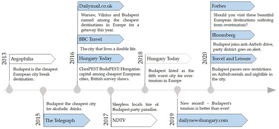The other factor that boosted demand for the night-time economy was news about cheap alcohol and entertainment opportunities. In the mid-2000s, budget airlines promoted the low price of beer in Hungary in their marketing campaigns [9]. News on websites until 2016 similarly portrayed Budapest as the cheapest urban destination among European cities with a focus on alcoholic beverages. Problems caused by heavy alcohol consumption and party tourism created resistance among locals against tourism development in the city [9]. Since 2018, the news has centered upon overtourism and its negative consequences. In order to mitigate the phenomenon, the government introduced new regulation that authorizes municipalities to decide on or limit the maximum period of Airbnb rentals. Figure 2 exemplifies the evolution of online news about the capital city for 2013–2020.